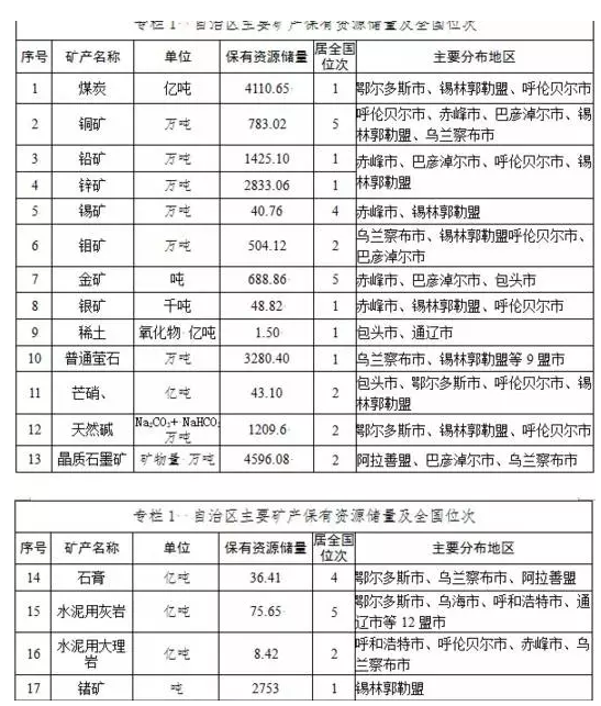 自治區(qū)礦產(chǎn)資源具有礦產(chǎn)種類多、分布較集中、資源潛力大的特點。以煤為主的能源礦產(chǎn)資源優(yōu)勢明顯,全區(qū)煤炭勘查累計估算資源總量為8518.80億噸,其中保有資源儲量為4110.65億噸,居全國第一位。已探獲的鈾資源量位居全國首位,已初步形成我國北方重要的鈾礦資源勘查開發(fā)基地。全區(qū)頁巖氣資源潛力巨大,鄂爾多斯地區(qū)頁巖氣預測資源量11.2萬億立方米。全區(qū)煤層氣資源豐富,分布廣、數(shù)量大、類型多,據(jù)國家最新煤層氣資源評價數(shù)據(jù),全區(qū)2000米以淺煤層氣潛在資源總量約為5.8萬億立方米;地熱和淺層地溫能資源豐富,但全區(qū)非常規(guī)能源礦產(chǎn)總體勘查和開發(fā)利用程度較低,尚未大規(guī)模開發(fā)利用。有色金屬和貴金屬礦產(chǎn)資源分布集中,有色金屬以銅、鉛、鋅、錫、鉬礦為主,貴金屬以金、銀為主,集中分布于中西部狼山—烏拉山地區(qū)和東部的大興安嶺中南段,具有規(guī)?;_采的天然稟賦條件。稀土資源得天獨厚,已探明的稀土氧化物保有資源儲量占全國98%以上,位居全國第一,具有占領(lǐng)國內(nèi)市場的潛力。非金屬礦產(chǎn)種類繁多,分布廣泛,多數(shù)可以保證國家與自治區(qū)經(jīng)濟發(fā)展的需要。